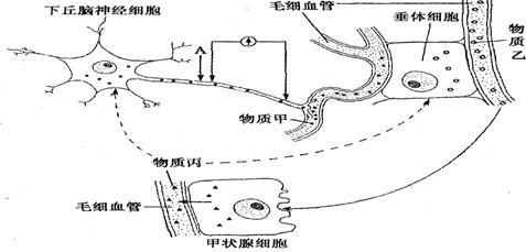 28. (8分)下图表示下丘脑神经细胞、垂体细胞、甲状腺细胞及它们分泌的激素之间的关系,研究表明物质乙是一种糖蛋白。请回答下列问题。