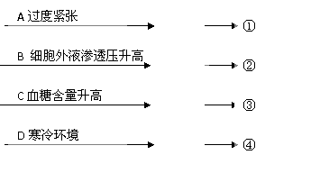 (1)由B造成,引起下丘脑分泌② ,最后使细胞外液渗透压下降
