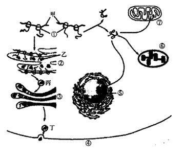 23(6分)下图表示细胞内蛋白质合成及其去向。①-⑦表示细胞结构,其中①是核糖体,②是内质网,③是高尔基体,甲-丁表示结构中的物质。请据图回答: