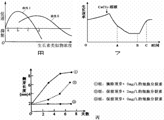 (2)研究人员用一定浓度的CaCl2和赤霉素对某植物种子胚轴生长的影响进行了相关实验,结果如乙图所示。由图可知,一定浓度的CaCl2对胚轴的生长具有 作用。根据赤霉素的生理作用推测,实验中加入赤霉素溶液的时间应在图中的 点。
