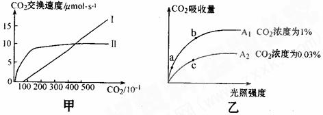 2、(12分)图甲表示A、B两种植物在75%的日照下,一个叶片在不同的CO2浓度下净CO2交换速度的变化,曲线I表示A植物、曲线Ⅱ表示B植物。图乙表示将A植物放在不同浓度CO2环境条件下,A植物光合作用效率受光照强度影响的变化曲线,请据图回答: