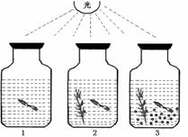 ①取三个相同体积的无色透明瓶分别标记为1、2、3号;②在1、2、3号瓶内加等量的水,3号加少许河泥;③选大小相似的同种小金鱼,在1、3中各加入1条,2中加入2条,并在2、3中加入等量的金鱼藻,都用橡胶塞塞紧,然后放在阳光下。记录结果如下: