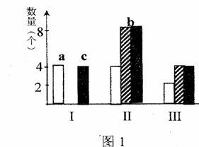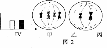 ( 1 ) 图 1 中 a-c 柱表示染色体的是 , 图 2 中表示二倍体体细胞分裂时期的 是 (2) 图 1 中 III 的数量关系对应于图 2 中的 ,图 2 中丙所示的细胞有 个染色体组。 (3) 图 l 中的数量关系由 I 变化为 II 的过程 , 细胞核内发生的分子水平的变化是 : 由 II 变化为 III, 相当于图 2 中的 → 过程。 (4) 符合图 1 中 IV 所示数量关系的某细胞名称是 。与图 1 中 对应的细胞内不可能存在同源染色体。 |