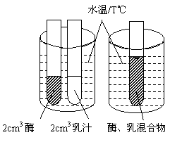 17、下图实验装置用于研究温度对凝乳酶催化乳汁凝固的影响。先将酶和乳汁分别放入2个试管,然后将2试管放入同一水浴(温度用T℃表示)中持续15min,再将酶和乳汁倒入同一试管中混合,保温并记录凝乳所需要的时间。通过多次实验,并记录在不同温度下凝乳所需要的时间,结果如下表: