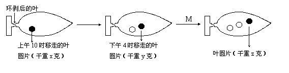 5、某同学欲测定绿色植物叶片叶绿体的光合作用速率,设计了如下图所示实验。在叶柄基部作环剥处理(仅限制叶片中有机物的输入和输出),于不同时间分别在同一叶片上陆续取下面积为1cm2的圆形叶片烘干后称其重量,测得绿色植物叶片的叶绿体光合作用速率 =(3y-2z-x)/6 g·cm-2·h-1 (不考虑取圆形叶片后对叶生理活动的影响和温度微小变化对叶生理活动的影响)。则M处的实验处理条件是: