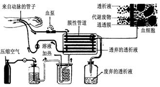7.(8分)如图是人工肾脏,它是由人工生物膜构成膜性管道,将管道浸浴在透析箱中,血液流经膜性管道后,血液中的代谢废物进入透析箱中,使血液变的清洁后流入人体血管。请就图示回答有关问题: