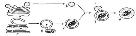 (1)b是刚形成的溶酶体,它起源于细胞器a;e是由膜包裹着衰老细胞器d的小泡,而e的膜来源于细胞器c。由图示可判断.a是_______,c是________,d是______________。