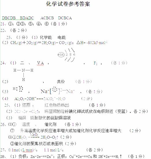 28、(6分) 在盛有500mL0.1 mol·L-1CuSO4和0.4 mol·L-1H2SO4混合溶液的大烧杯中。用锌、铜作电极,用导线连接形成原电池,当电极锌消耗6.5g时,试完成: