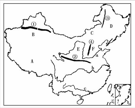答案:(1)①天山 ②秦岭 ③大兴安岭 ④太行山(4分)(2)A青藏高原 B塔里木盆地 C内蒙古高原 D东北平原 E黄土高原 F华北平原(6分)(3)a b c(6分)(4)②或秦岭 湿润或半湿润 半湿润或湿润 亚热带或暖温带 暖温带或亚热带(10分)