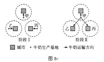图8为“甲、乙、丙三个地区牛奶生产和销售模式的变化图” ,回答21-22题。