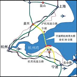 跨海大桥,国道主干线-同三线跨越杭州湾的便捷通道。将于5月1日全线通车。大桥北起嘉兴市海盐郑家埭,跨越宽阔的杭州湾海域后止于宁波市慈溪水路湾,全长36Km。形成以上海为中心的江浙沪两小时交通圈。读图和材料,回答10-11题: