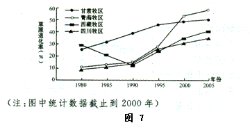 读我国四个牧区超载起止年份.超载持续时间和年平均超载率表及四个牧区草原退化趋势图(图7),完成15.16题。