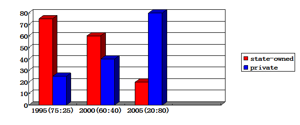 As can be seen from the chart, ownership of houses in a big city in China changed in the past ten years. In 1995, 75 percent of the houses were state-owned. Five years later, the rate of state-owned houses to private ones was 3 to 2. But from then on, the ownership of houses changed rapidly and so far 80 percent of houses have been private.