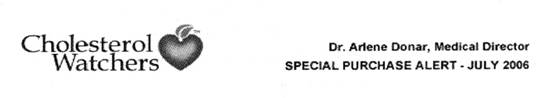 “BEST PRODUCT WE'VE EVER SEEN”-THIS REALLY WORKS-ON SALE NOW Need to lower your cholesterol(胆固醇)?We strongly recommend CholestrolblockTM. This really works, and now is the best time to buy,because of a special offer for the first 250 customers only for a limited time. * Takes cholesterol out of food,no matter what you eat. * Clinically demonstrated effective in university and hospital testing. * Lowers cholesterol absorption up to 42% or more. * “NO SIDE EFFECTS unlike Liptor®, Zocor®,Crests®&other commonly prescribed(处方的) medications-safe and effective. * “Outsells all other brands on Internet every month. LIMITED TIME ONLY一Try Cholesterol Watchers free with purchase. |