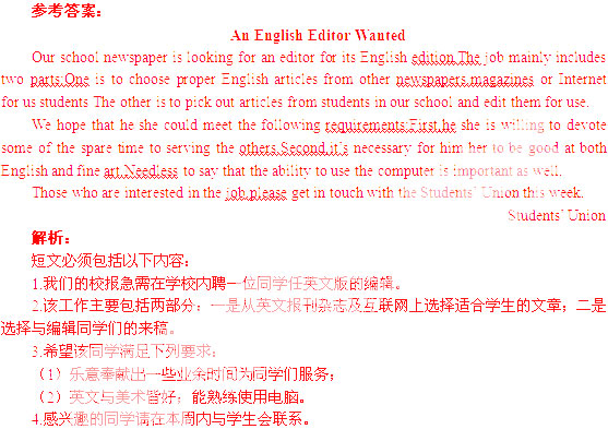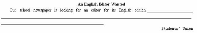 假设你是校报负责人,急需在学校内聘一位同学任英文版的编辑,请你用英文以“An English Editor Wanted”为题目写一则招聘启事。内容要如下: