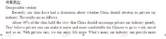 最近,你班组织全班同学进行了一场英语讨论。讨论的主题是:中国是否应该发展私家车?请你根据下表所提供的信息,给报社写一篇报道,客观地介绍讨论的结果。