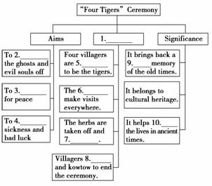 After visiting all 30 or 40 households,the herbs were removed from the tigers and burned,to indicate that all the ghosts had been conquered.Then the villagers knelt and kowtowed with the sound of firecrackers,marking the end of the ceremony.
