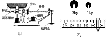 25. 图甲为商店里使用的台秤,其工作原理与天平相同.使用时,先将游码移至左端0刻度处,若发现秤杆右端上翘,则调零螺丝应向 (选填“左”或“右”)旋动才能使秤杆平衡;现用该台秤称某物体质量,通过在砝码盘中添加槽码、移动游码使秤杆平衡,所加的槽码和游码的位置如图乙所示,则该物体的质量为______kg。