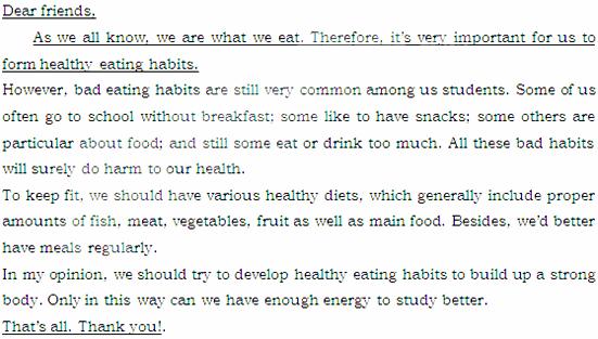假如你是学生会生活部委员,你将组织学生对“日常饮食与身心健康”这一话题进行讨论。请根据下列调查结果要点提示,用英语写一篇讨论发言稿。内容要点应包括: