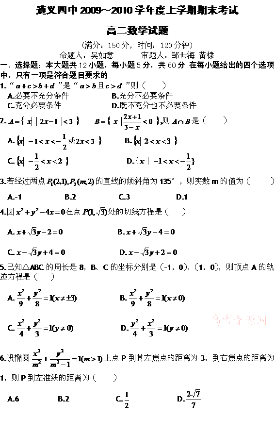 遵义四中2009---2010学年度第一学期期末考试试卷