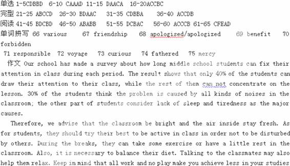 最近你校就 “中学生课堂注意力”在学生中进行了调查,下面的表格为你校的调查结果(表中数据为学生人数百分比)。请你向某英文报纸投稿,根据所提供的信息介绍调查结果并根据提示给出改善建议。