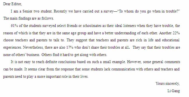 假如你是高中二年级的学生李刚,你在学校组织了一项“有烦恼向谁说”的调查活动。请用英语给校报编辑写一封信,反映相关情况。内容包括:调查结果(如图所示)、持相应想法的理由及你对这个问题的看法。
