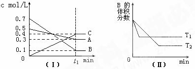 13.T℃时,A气体与B气体反应生成C气体。反应过程中A、B、C浓度变化如图(Ⅰ)所示,若保持其他条件不变,温度分别为T1和T2时,B的体积分数与时间的关系如图(Ⅱ)所示,则下列结论正确的是( )