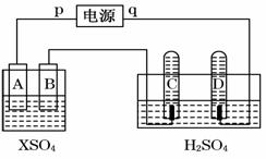 29.(10分)如图,p、q为直流电源两极,A为+2价金属单质X制成,B、C、D为铂电极,接通电源,金属X沉积于B极,同时C、D产生气泡.试回答: