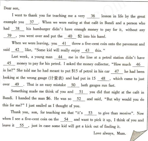 The day __50_ came when James counted his money and found $ 94. 32. He _51___ no time and went down to the shop to pick up the bicycle he wanted. He rode __52__ home, looking forward to showing his new bicycle to his friends. It had been hard _53__ for the money, but James knew that he valued his bicycle far more _54__ he had bought it with his own money. He had _55__ what he thought was impossible, and that was worth even than the bicycle.