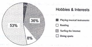 Quality-oriented Education is being carried out in our province now. Our school calls on us to develop varieties of hobbies and interests. A recent survey shows what the students of our school like to do in their spare time. From the pie chart, we can see 53% of the students like sports, so doing sports is the most popular activity in our school. The second popular activity for students is surfing the Internet and 36% of the students have interest in it. Only a few students, about 8 percent of them, take reading as a hobby. And even fewer are fond of playing musical instruments.