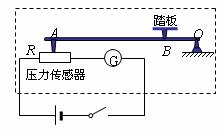 有一种测量人体重的电子秤,其原理图如图16中的虚线所示,它主要由三部分构成:踏板和压力杠杆ABO、压力传感器R(是一个阻值可随压力大小而变化的电阻器)、显示体重的仪表G(其实质是电流表)。已知压力传感器的电阻与其所受压力的关系如下表所示: