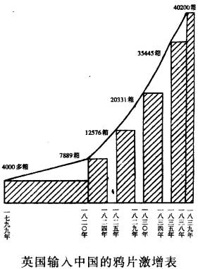 ②在鸦片战争前的40年中,英国走私运入中国的鸦片有40多万箱,从中国掠走大约三四亿银元。1800年,英国的鸦片收入为124万多两白银,到1838年增长到519万多两白银。这是一笔骇人听闻的掠夺账。