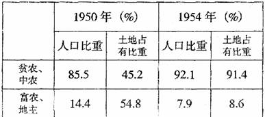 15.下表反映了1950年和1954.年中国农村不同阶级人口及其占有土地的比重,导致这一比重变化的原因是