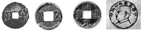 ①秦半两钱 ②隋五铢钱 ③开元通宝 ④民国银元