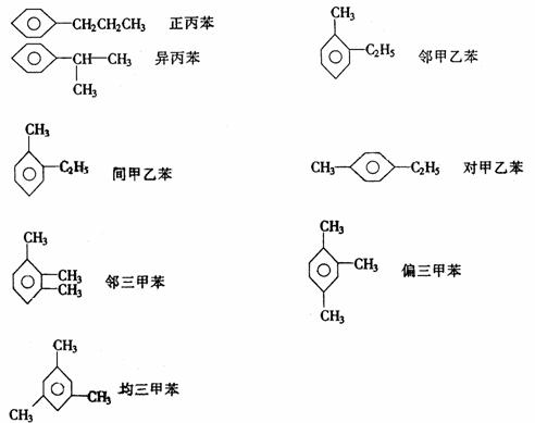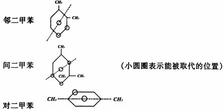 判断因取代基位置不同而形成的同分异构体时可采用“对称轴”法。即在被取代的主体结构 中,划对称轴,取代茎只能在对称轴的一侧,或是在对称轴上而不能越过对称轴(针对一元取代物而言)。如二甲苯的对称轴如下(虚线表示):