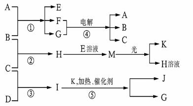 物质A由X、Z构成,B、C、D、K都是单质,反应①-⑤都是用于工业生产的反应,各有关物质之间的相互反应转化关系如下图所示: