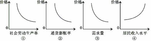 14.下列示意图反映的是通常情况下价格与相关因素的关系。其中①②④分别反映的是价格随社会劳动生产率、通货膨胀率、居民收入水平变化的曲线,③反映的是需求量随价格变化的曲线。这些示意图中正确反映价格与相关因素关系的是: ( )