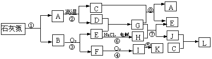 9.已知图31-2每一方框中的字母代表一种反应物或生成物(图中部分反应物或生成物没有列出)。其中,化合物石灰氮是由Ca、N、C等三种元素组成的盐,它以前是一种常用的肥料,其含钙、碳的质量分数分别为50%、15%。反应①是石灰氮的完全水解,其产物之一可方便地制成一种氮肥。通常状况下,C为气体。