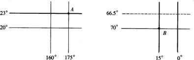 32.根据图中A、B两地的经纬度位置,认真分析,并填写下表: