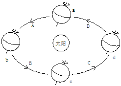 例4 如图2-2所示是地球公转示意图,a、b、c、d分别表示“两分”、“两至”和4个节气(北半球),A、B、C、D分别表示“两分”、“两至”和4个节气之间的时段,读图回答: