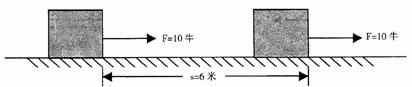 39、如图所示,水平面上有一实心正方体,边长a为10厘米,质量m为5千克。在大小为10牛顿的水平拉力F作用下,在时间t为5秒钟内,匀速向右移动路程s为6米。请你利用上述数据,结合示例格式,任意选择五个未知量,完成下表(不能计算面积和体积)。