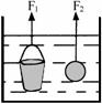 如图所示,将系于绳端质量相等的铁桶和实心铁球同时浸没在水中,静止在图示位置,绳子对它们的拉力F1和F2的大小关系是