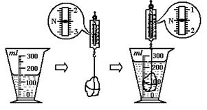 亮亮利用一只量杯(装有适量的某种液体)、一根细线和一只弹簧测力计测量一个形状不规则的固体物块的密度(该物块不吸收任何液体),实验流程如右图所示,根据图示可读出物块重为_______N,物块的体积为_______cm3,计算出物块的密度ρ物=_______kg/m3,该液体的密度ρ液=_________kg/m3。