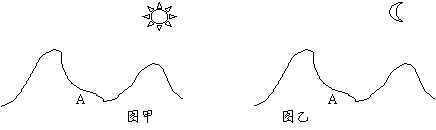 中考资源网 2、上午,在阳光照射下,山顶比山谷的气温升高得快;晚上,太阳下山后,山顶比山谷降温快。因此,一天中山坡上会出现沿山坡自上而下的“山风”和自下而上的“谷风”。请在甲、乙两图中标出山坡A处的风向。