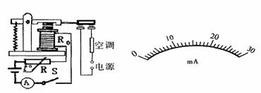 36.图36a是某同学为学校办公楼空调设计的自动控制装置,R是热敏电阻,其阻值随温度变化关系如下表格所示。已知继电器的线圈电阻R0为10Ω,左边电源电压为6V恒定不变。电流表O-30mA量程接入电路,图b是电流表表盘。当继电器线圈中的电流大于或等于15mA时,继电器的衔铁被吸合,右边空调电路正常工作。