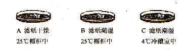 29.某同学做了“探究影响玉米种子萌发的环境条件”的实验:在A、B、。c三个干净的培养皿中分别铺上两层滤纸,再将相同数量的玉米种子放在上面,在不同条件下进行培养(如 下图)。数日后记录发芽情况如右表: