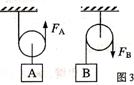 25、如图3所示,物体 A 和 B 所受重力都为120N,滑轮重力不计。当分别用力匀速提升物体A和B时,FA为 N,FB为 N。