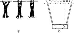 33、小明发现:同学们做引体向上活动时,双手握杠间距有以下几种情况:有比肩宽大的,有与肩同宽的,也有比肩宽小的,如图甲。那么,这几种握杠方法的“省力“程度一样吗?爱动脑筋的小明进行了大胆的猜想,并完成了以下实验:用两根相同的橡皮条系上重物挂在水平杆子上,如图乙,改变橡皮条在杆上所挂的位置,并观察每次橡皮条的长度。结果如下表: