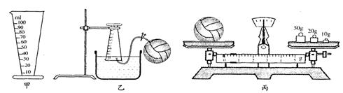 27.(4分)小明用如下实验测定所处环境的空气密度。中考资源网他用气筒将皮球打足气,用天平称出此时皮球的质量为81.6g。中考资源网将如图甲所示的量杯装满水后,倒放在水槽中,用气针和乳胶管将皮球中的空气引入量杯内,用排水集气的方法慢慢排出皮球中的气体,如图乙所示,同时调整量杯的高度,使量杯内气体达到量杯的最大测量值,且量杯内、外水面相平。中考资源网此时,用夹子夹紧乳胶管暂停放气。中考资源网再将量杯装满水后重新集气,如此共进行10次。中考资源网拔出气针,用天平称出此时皮球和剩余气体的质量,如图丙所示。中考资源网请根据实验及图中所示情况,帮助小明完成下面的实验数据表格。中考资源网