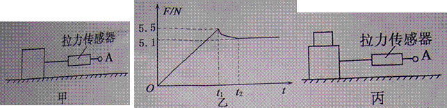 28.(6分)中考资源网如图甲所示,用一拉力传感器(能感应力大小的装置)中考资源网水平向右拉一水平面上的木块,A端的拉力均匀增加,0 -tl时间木块静止,术块运动后改变拉力,使木块t2后处于匀 速直线运动状态。中考资源网计算机对数据拟合处理后,得到如图乙所示拉力随时间变化图线,回答下列问题: